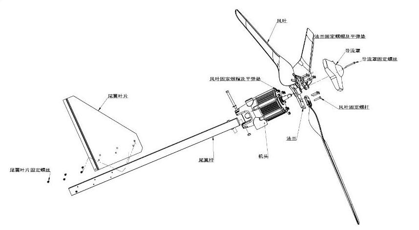 8、采用自動對風(fēng)裝置,使風(fēng)力發(fā)電機自動調(diào)整對準(zhǔn)迎風(fēng)方向,兼顧調(diào)向靈敏性和穩(wěn)定性,風(fēng)力較大情況下發(fā)電機尾翼斜置限速保護風(fēng)機不受損。